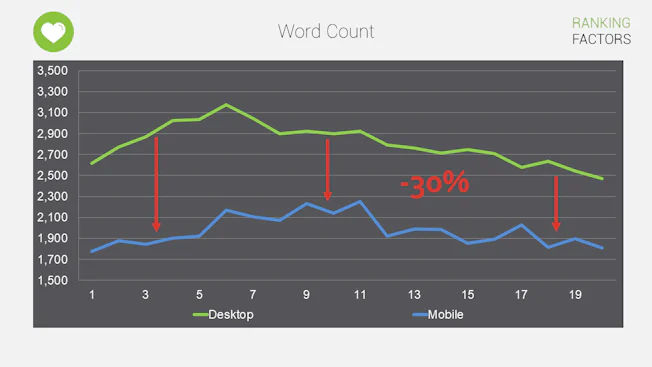 So, your content needs to be shorter for mobile searches. This is shown very clearly by our analysis at Searchmetrics of US healthcare data. When you compare desktop vs mobile content in the top 20 Google search results – high ranking mobile content is 30% shorter on average, with much shorter lists than desktop. This is all logical – you have less screen real estate on your mobile device and less time to view it.